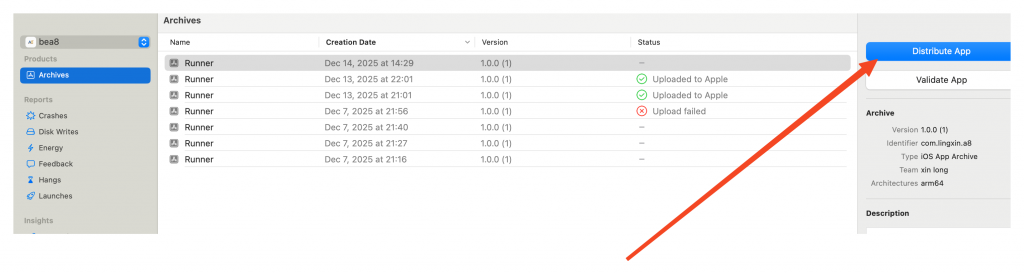 2、点击 prodduct/archive 进行构建,并分发至 app connect。